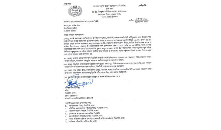 যেহেতু আপনাদের এহেন কার্যকলাম বিএডিসি কর্মচারী চাকরী প্রবিধানমালা ১৯৯০ এর ৩৯ (ক)(খ)(চ) দায়িত্ব পালনে অবহেলা, অসদাচারণ, চুরি, আত্মসাত, হতবিল তছরুপ ও প্রতারণার সামিল। ফলে আপনি বা আপনাকে ১৯৯০ এর ৪৫ (১) বিধি মোতাবেক সংস্থার চাকরী থেকে সাময়িক বরখাস্ত করে অতিরিক্ত মহা ব্যবস্থাপন (খামার) বিএডিসি ঢাকা দপ্তরে সংযুক্তি করা হলো। এই সময়ে সাময়িক বরখাস্তকালীন বিধি মোতাবেক খোরপোষ ভাতা প্রাপ্য হবেন এবং কর্তৃপক্ষের অনুমতি ব্যতিত কর্মস্থল ত্যাগ করতে পারেন না।