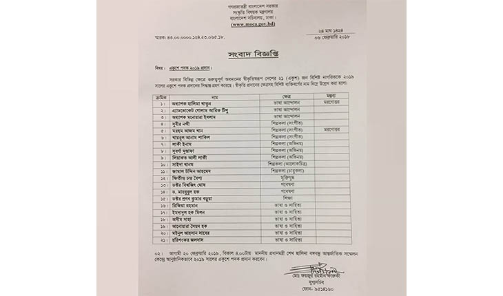 শনিবার যুগ্মসচিব মোঃ ফয়জুর ফারুকী স্বাক্ষরিত এক তালিকায় এই ২১ গুণী ব্যক্তির নাম ঘোষণা করা হয়েছে।