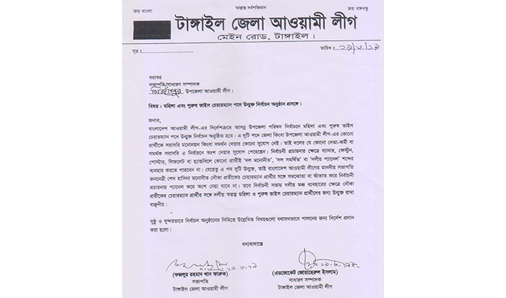 মঙ্গলবার টাঙ্গাইল জেলা আওয়ামী লীগের সভাপতি ও সম্পাদক স্বাক্ষরিত দলীয় প্যাডে ভাইস চেয়ারম্যান পদে উন্মুক্ত নির্বাচন অনুষ্ঠিত হবে। প্রচারণার ক্ষেত্রে ব্যানার, ফেস্টুন, পোস্টার, লিফলেট বা হ্যান্ডবিলে কোনো প্রার্থীই দল মনোনীত, দল সমর্থিত বা দলীয় প্যানেল শব্দের ব্যবহার করতে পারবেন না। শেখ হাসিনা মনোনীত নৌকা প্রতীকের চেয়ারম্যান প্রার্থীর সঙ্গে সমঝোতা বা আতাত করে নির্বাচনী প্রচারণায় প্যানেল করে অংশ নেয়া যাবে না উল্লেখ রয়েছে।