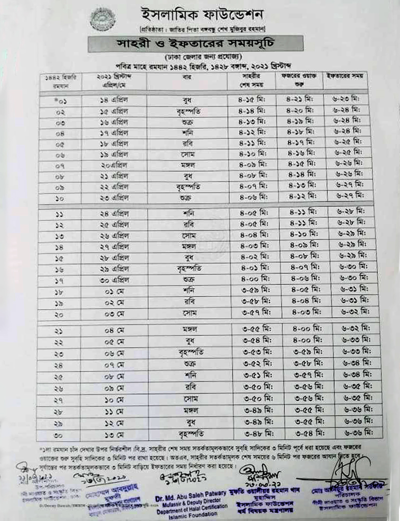 রবিবার (২১ মার্চ) গণমাধ্যমে এ চিঠি পাঠিয়েছে ইসলামিক ফাউন্ডেশন। গত ১৩ মার্চ ইসলামিক ফাউন্ডেশন ১৪৪২ হিজরির রমজান মাসের সেহরি ও ইফতারের এ সময়সূচি চূড়ান্ত করে।